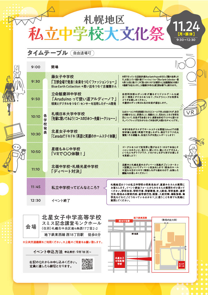 この度、札幌地区私立中学校会では、小学生とその保護者などを対象とした私立中学校の魅力や学びの多様性を紹介するイベントを企画いたしました。北海道の子どもたちの「学びの環境」についてその選択の幅を広げ、「学び」が本来もつ「生きる力」「夢見る力」の醸成を感じてもらえたらと考えております。